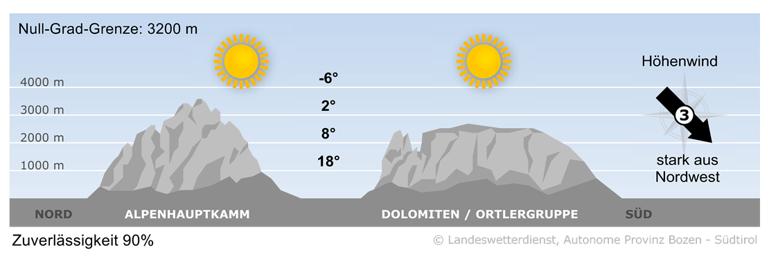 Wind in hochalpinen freien Lagen: In 1500 m von 0 bis 40 km/h, in 2000 m von 0 bis 50 km/h, in 3000 m starker Wind von 10 bis 50 km/h im Mittel, im Osten am Hauptkamm und im Süden Sturmböen von 20 bis 90 km/h aus dem Sektor Nordost.