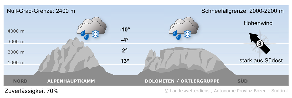 Wolken und Nebel schränken auf Südtirols Bergen die Sicht ein. Dazu muss man zeitweise mit Regen rechnen, die Schneefallgrenze liegt um 2000 m.
