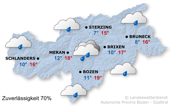 Über Südtirol halten sich viele Wolken und zeitweise fällt Regen. Am meisten regnet es vom Ultental bis ins Passeiertal und in den Dolomiten, am wenigsten zwischen Brixen und Bruneck sowie im oberen Vinschgau.