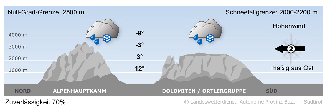 Meist dominieren die Wolken und gebietsweise regnet es, oberhalb von 2200 m fällt Schnee. Am Nachmittag muss man nur mehr stellenweise mit Schauern rechnen. Dazwischen gibt es auch trockene Phasen und Aufhellungen.