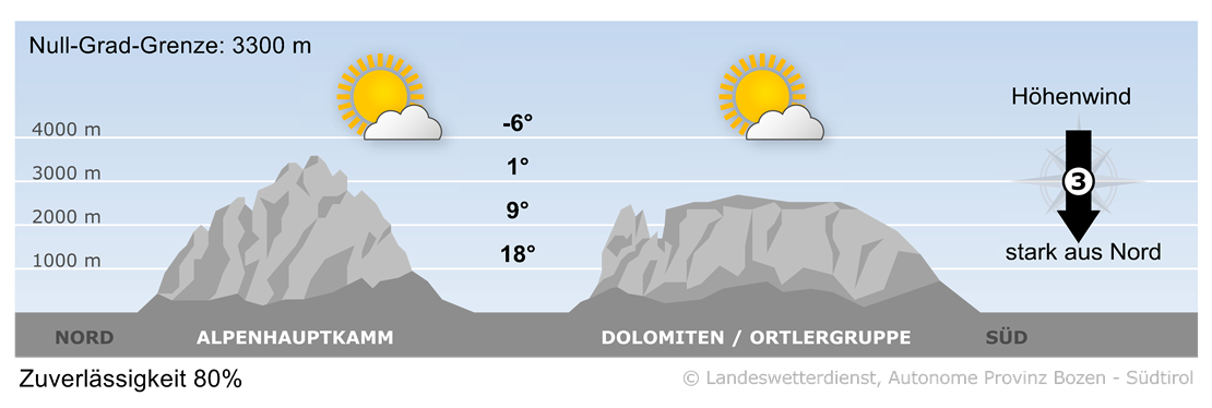 Wind in hochalpinen freien Lagen: In 1500 m von 0 bis 60 km/h, in 2000 m von 0 bis 70 km/h, in 3000 m steifer Wind von 10 bis 60 km/h im Mittel, schwere Sturmböen von 20 bis 100 km/h aus dem Sektor Nord.