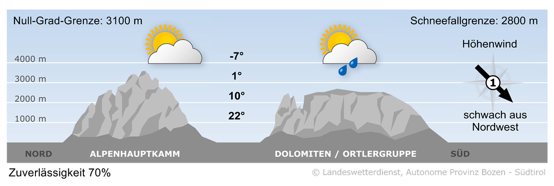 Am Vormittag überwiegt auf den Bergen der Sonnenschein. In der zweiten Tageshälfte entwickeln sich einige Quellwolken, und vor allem in den Dolomiten können sich ein paar Regenschauer bilden.