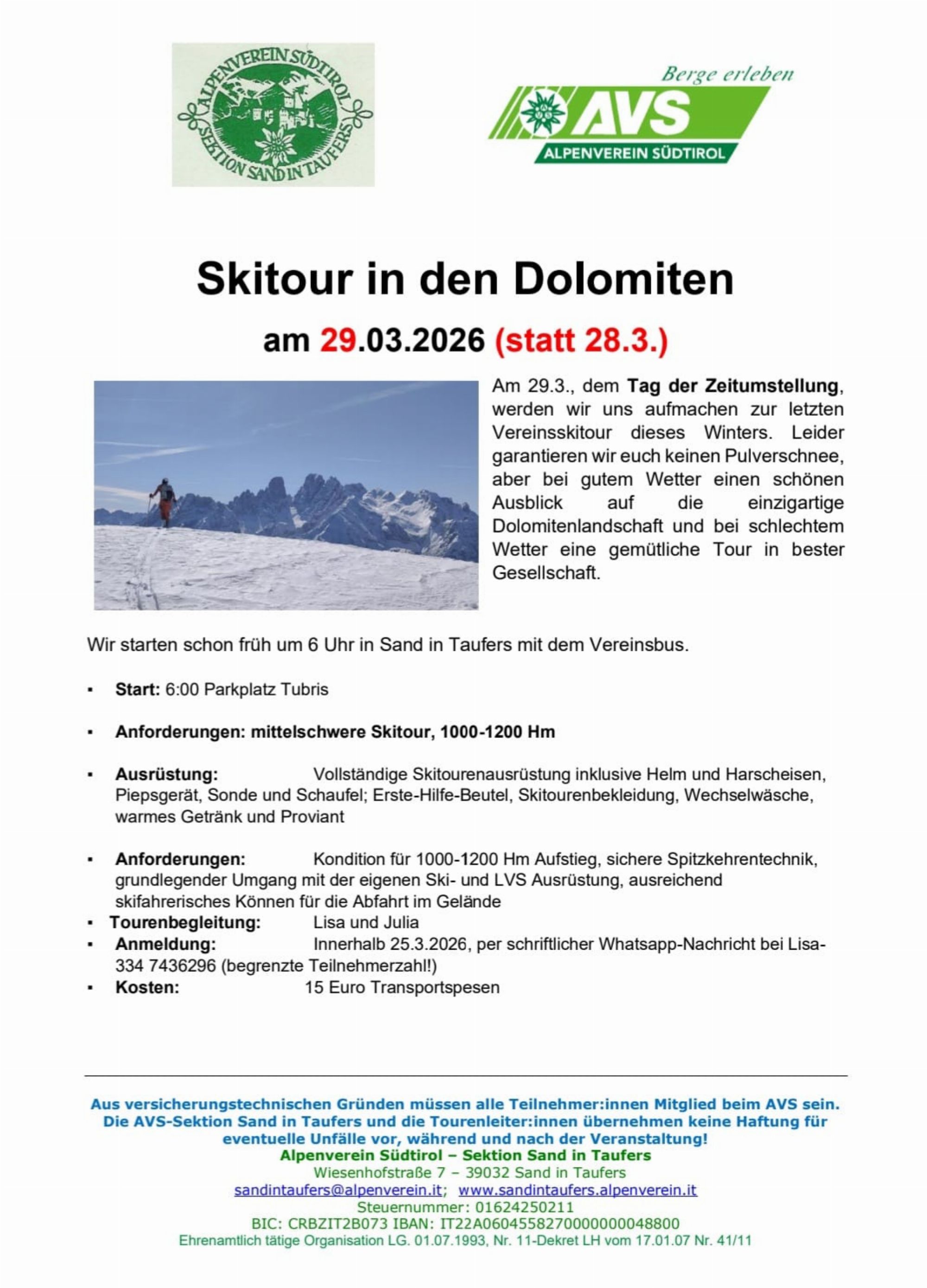 Programm:Wir starten in Sand in Taufers und fahren mit dem Vereinsbus in die Dolomiten, um hier eine Skitour zu machen.