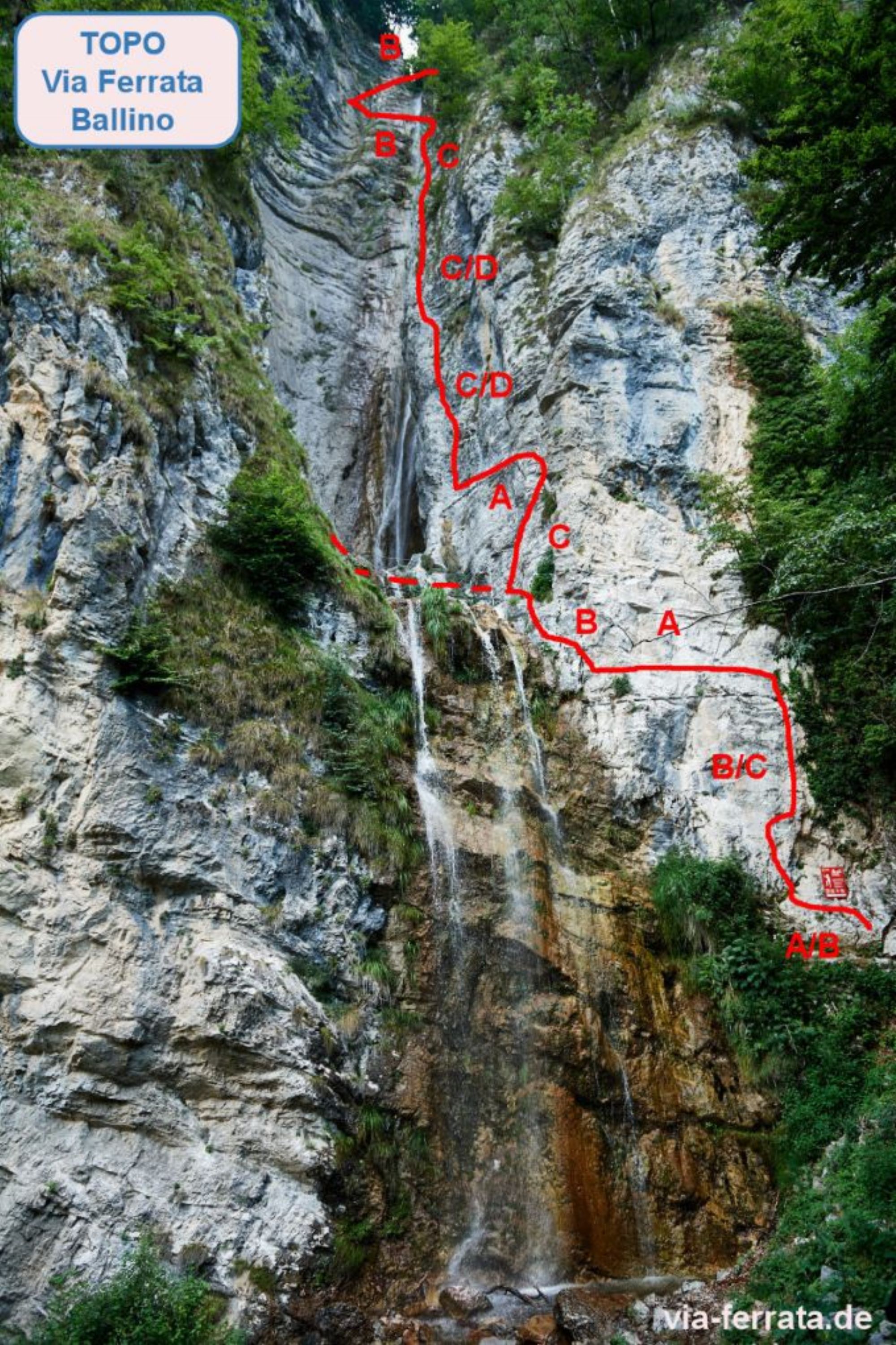Im Frühsommer 2019 wurde die bisher kleine aber feine Via Ferrata Ballino aus dem Wasserfallkessel heraus verlängert Die Fortsetzung führt nun steil (senkrecht!) direkt rechts vom Wasserfall Rio Ruzza empor. Die steile Wasserfallwand wurde mit unzähligen Bügeln versehen (und teils auch mit künstlich in den Fels geschlagenen Trittstufen), so dass es quasi eine lange Leiter bis hoch zur Wasserfallkante ist. Ganz oben wird dann der Wasserfall mit 2 Seilbrücken zweimal spektakulär gequert.