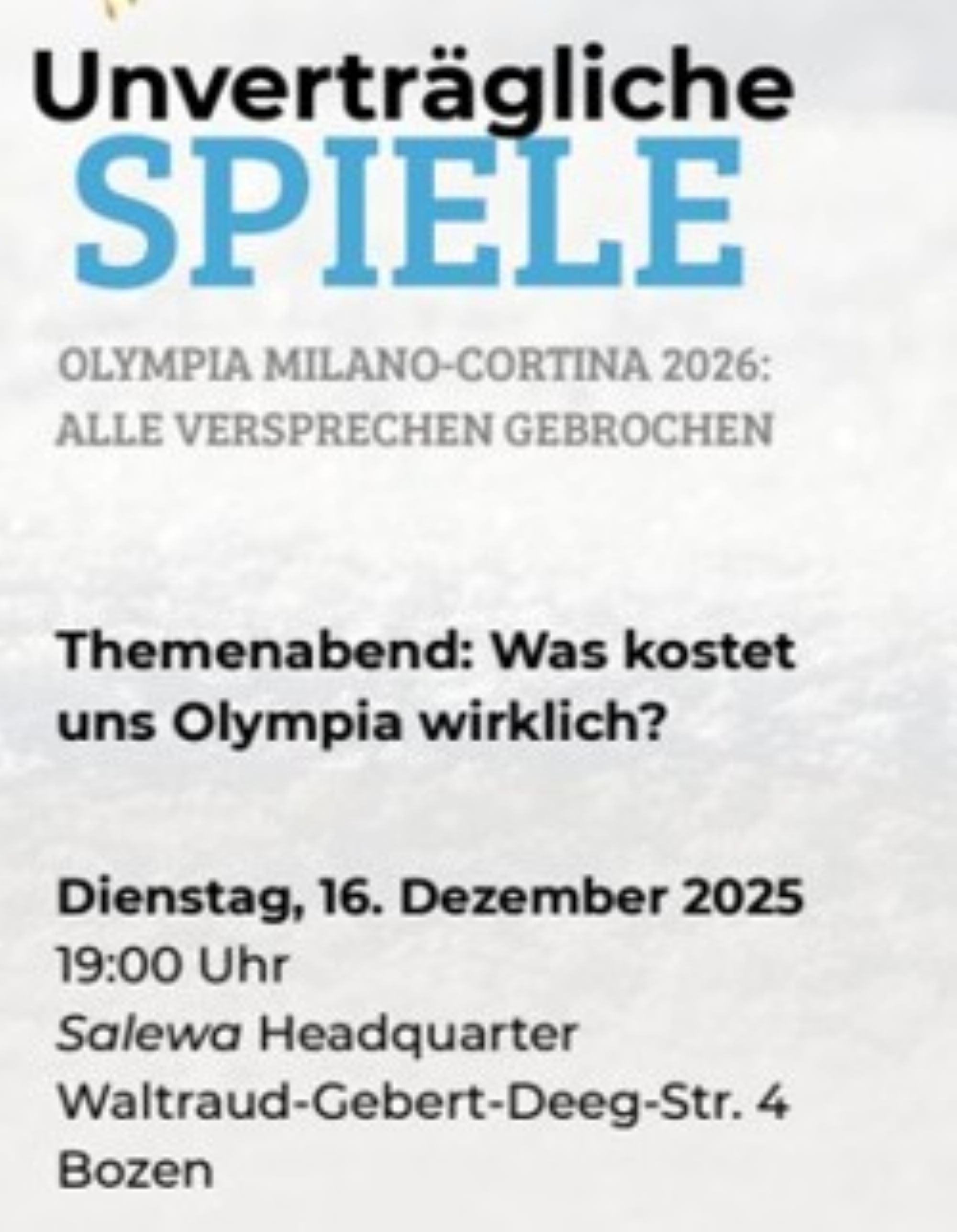 Wir dürfen auf den Themenabend: Was kostet uns Olympia wirklich? mit namhaften Referent:innen am 16.12.2025 um 19 Uhr im Salewa Headquarter in Bozen hinweisen.