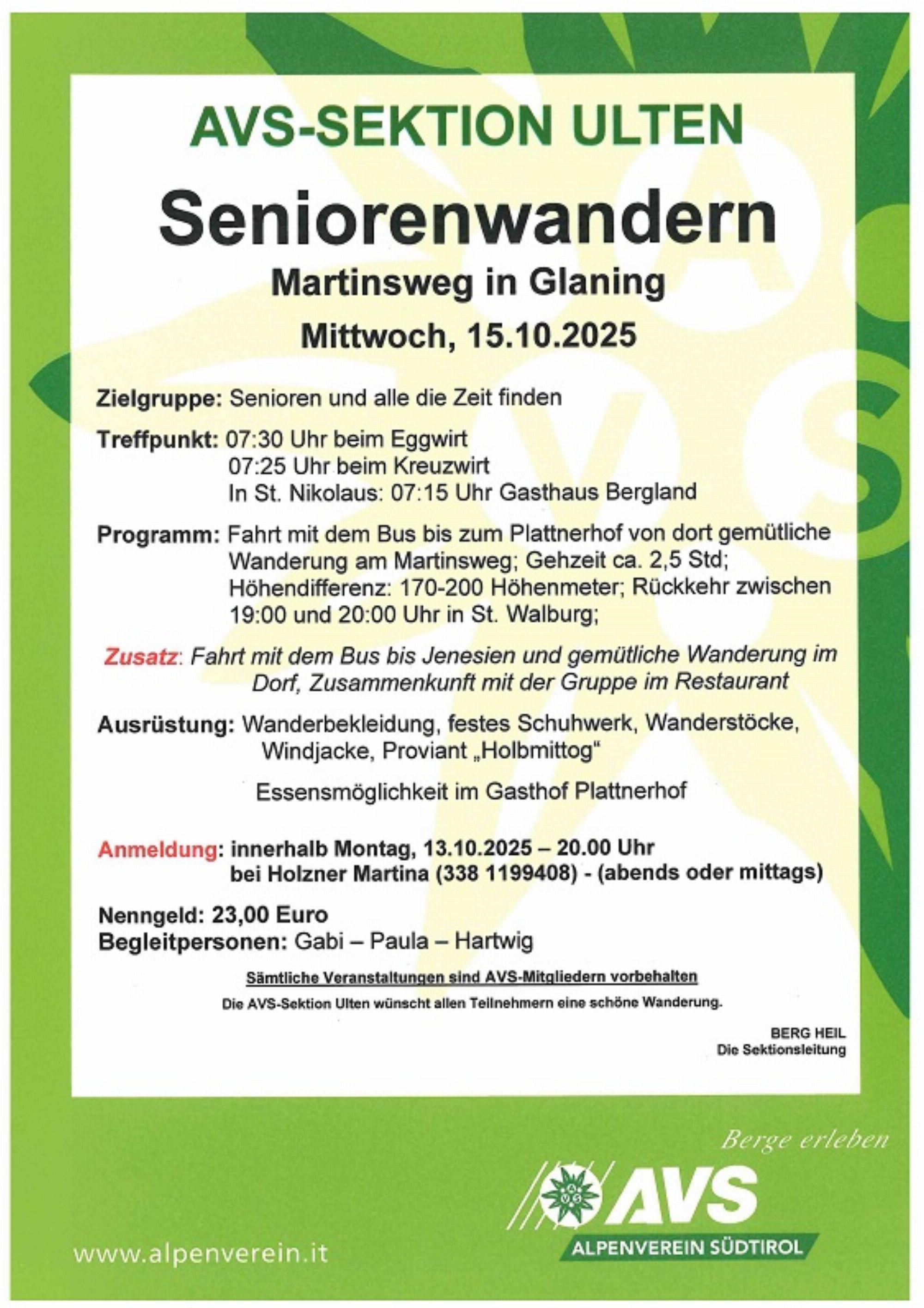 Anmeldung: Martina HolznerMobil: +39 338 1199408