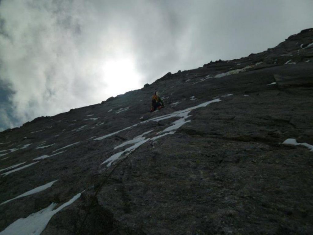 Am besten präsentiert sich die Wand im Frühling wenn sich der Schnee gesetzt hat und in der Anfangsrinne ein Eisschlauch ist. Weder von den Erstbegehern, noch von uns wurde irgendein Material hinterlassen!